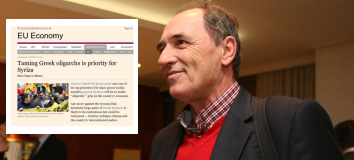 Ο ΣΥΡΙΖΑ εκτόξευσε τις μετοχές του στο ελληνικό πολιτικό σκηνικό τρία χρόνια πριν όταν άνοιξε τον πόλεμο ενάντια στους διεθνείς δανειστές και τώρα που βρίσκεται μια ανάσα από την εξουσία, φωτογραφίζει έναν νέο δημόσιο κίνδυνο: τους ολιγάρχες που ασκούν μια δυσανάλογα μεγάλη επιρροή στην ελληνική οικονομία. Αυτό σημειώνουν οι Financial Times που φιλοξενούν συνέντευξη του σκιώδους υπουργού Ανάπτυξης του ΣΥΡΙΖΑ, Γιώργου Σταθάκη.
