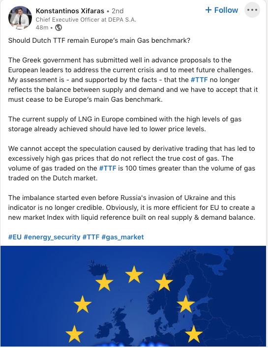 Πιο συγκεκριμένα σε ανάρτησή του σε μέσο κοινωνικής δικτύωσης ο κ. Ξιφαράς εκφράζει την εκτίμηση, η οποία υποστηρίζεται και από τα δεδομένα της αγοράς, ότι ο δείκτης TTF δεν αντανακλά πλέον την ισορροπία μεταξύ προσφοράς και ζήτησης και ως εκ τούτου θα πρέπει να αποδεχθούμε ότι πρέπει να πάψει να αποτελεί το κύριο σημείο αναφοράς για την Ευρώπη.