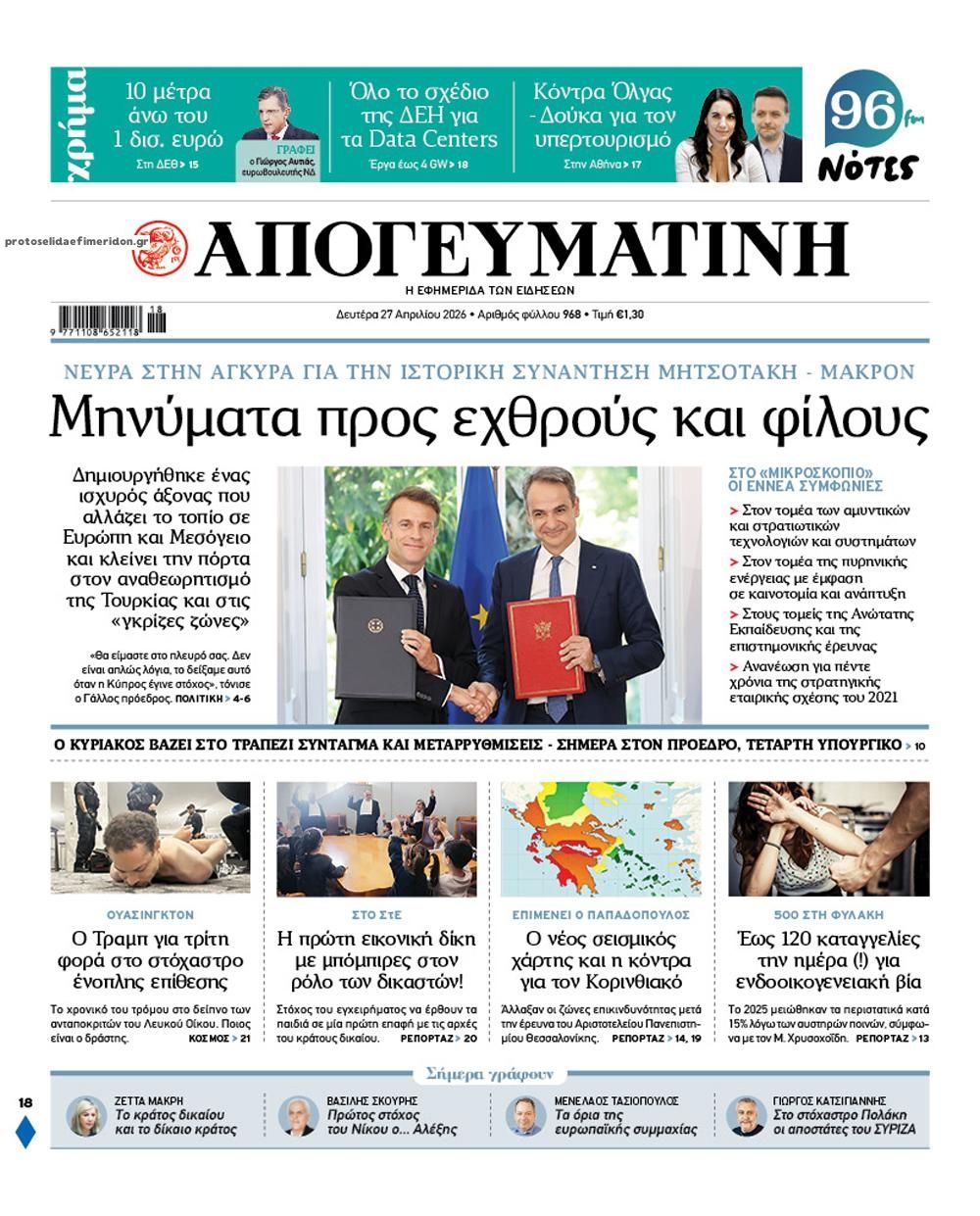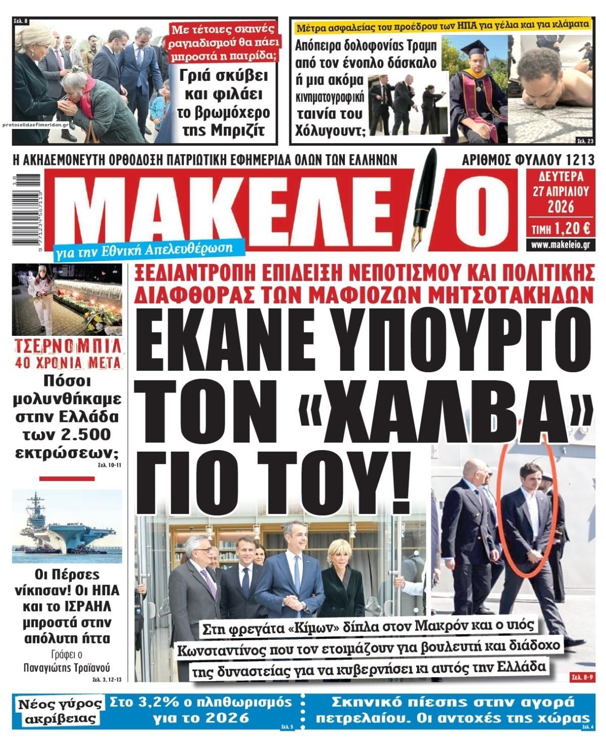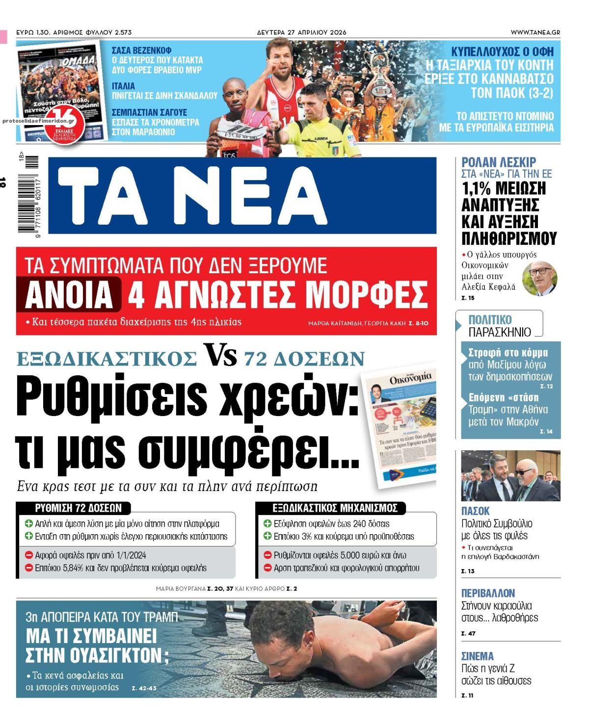 Media Οι εφημερίδες της Δευτέρας 27 Απριλίου 2026 27/04/2026 08:46 FacebookXPinterestWhatsApp Οι εφημερίδες της Δευτέρας 27 Απριλίου 2026