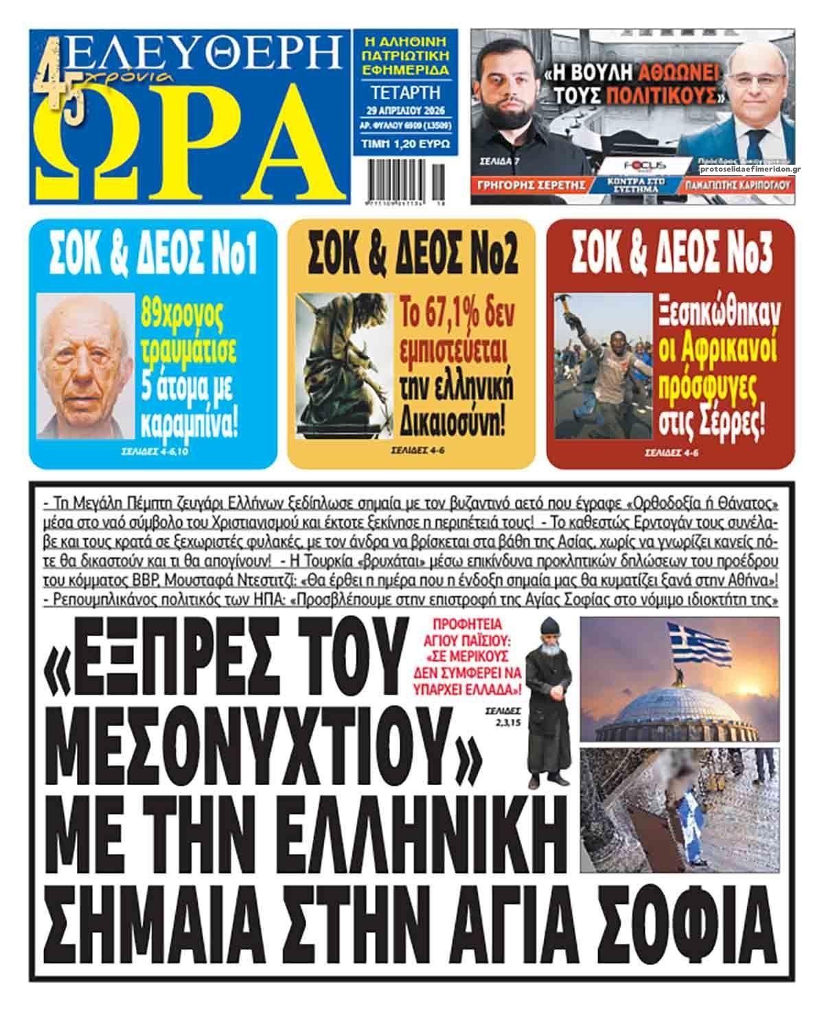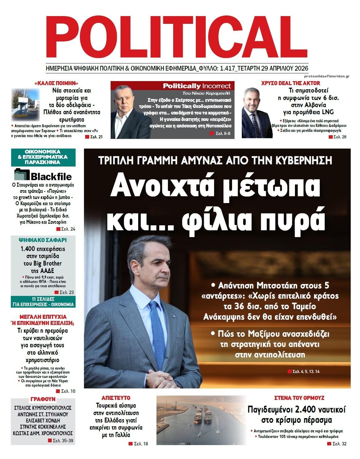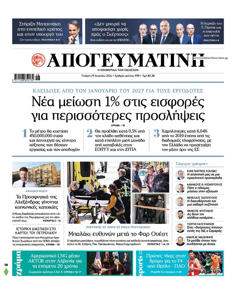 Οι εφημερίδες της Τετάρτης 29 Απριλίου 2026