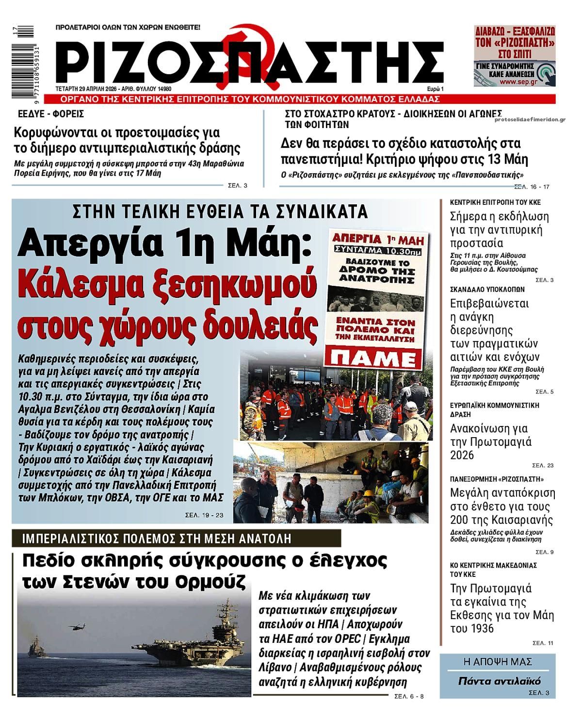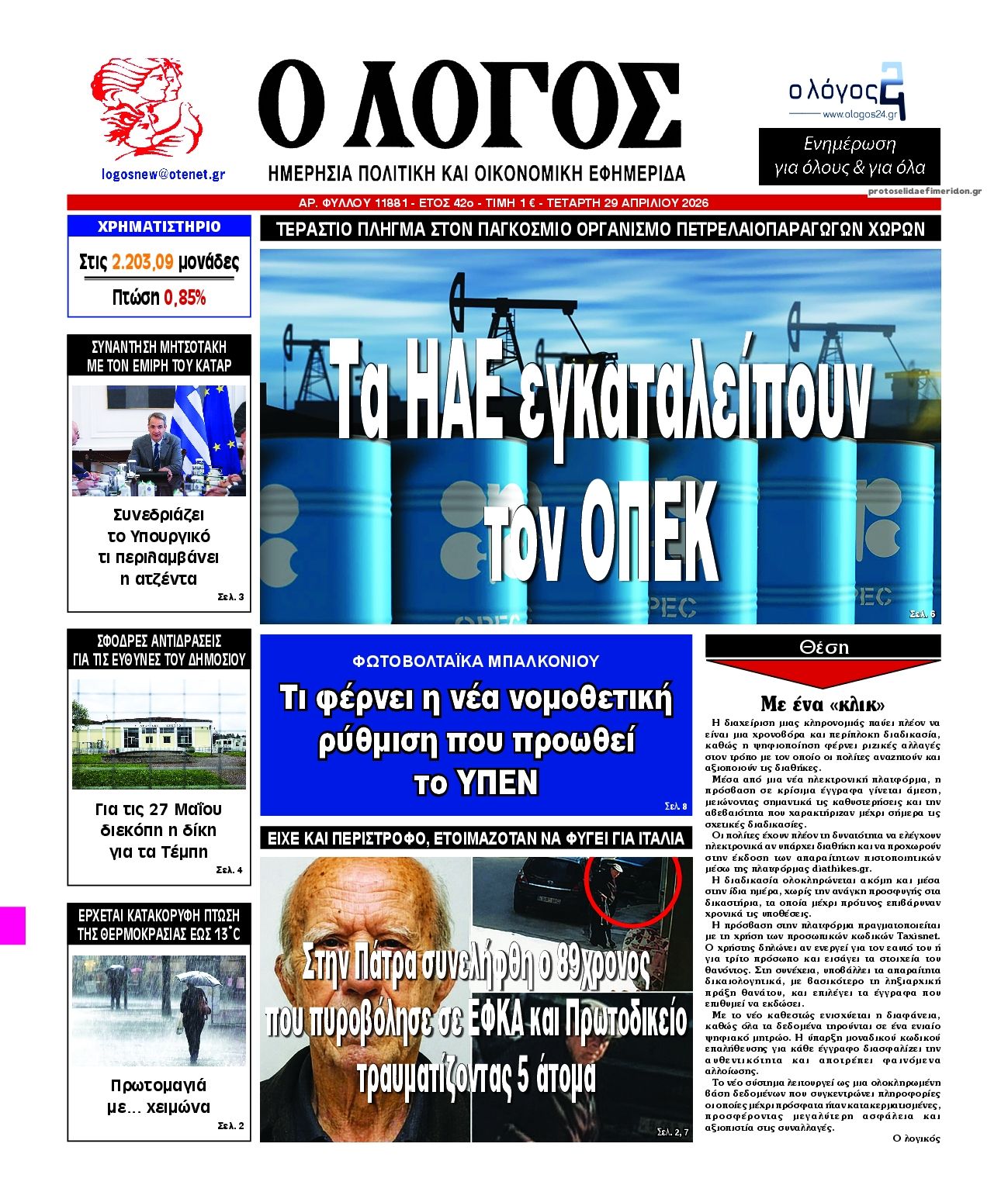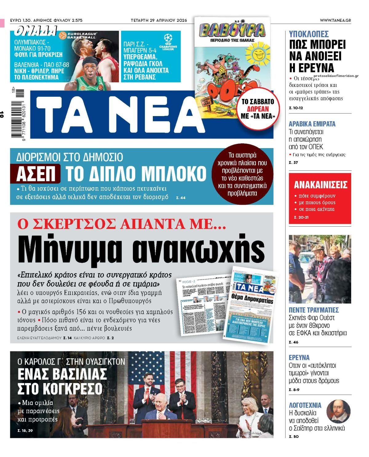 Οι εφημερίδες της Τετάρτης 29 Απριλίου 2026