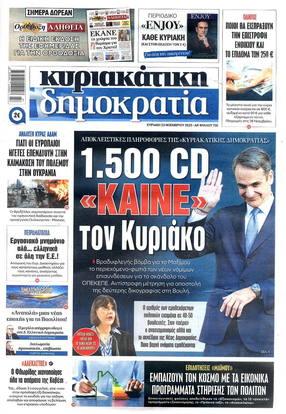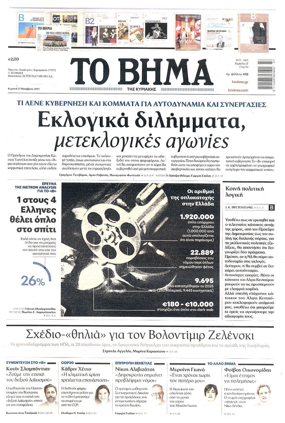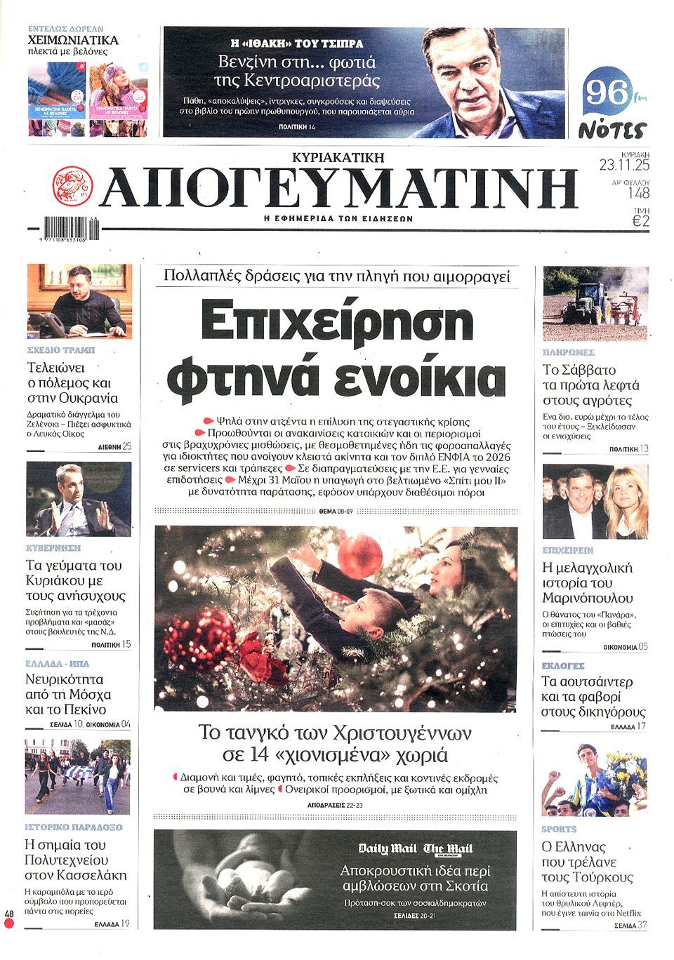 Mediatop2 Τα πρωτοσέλιδα των εφημερίδων της Κυριακής 23 Νοεμβρίου 2025 22 Νοεμβρίου 2025 FacebookTwitterPinterestWhatsApp Διαβάστε τα πρωτοσέλιδα των εφημερίδων της Κυριακής 23 Νοεμβρίου 2025