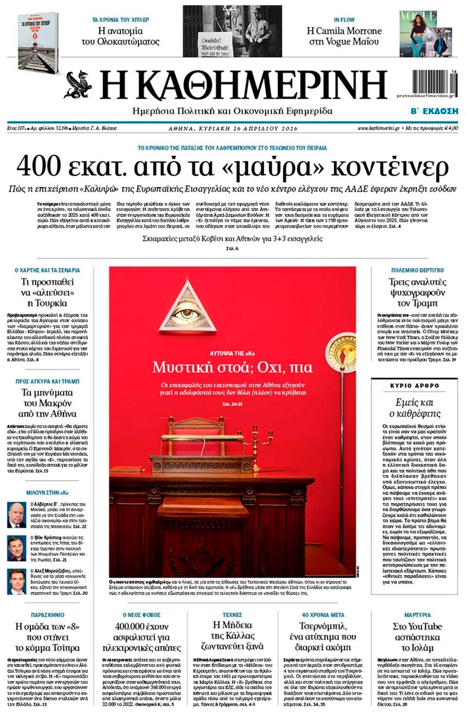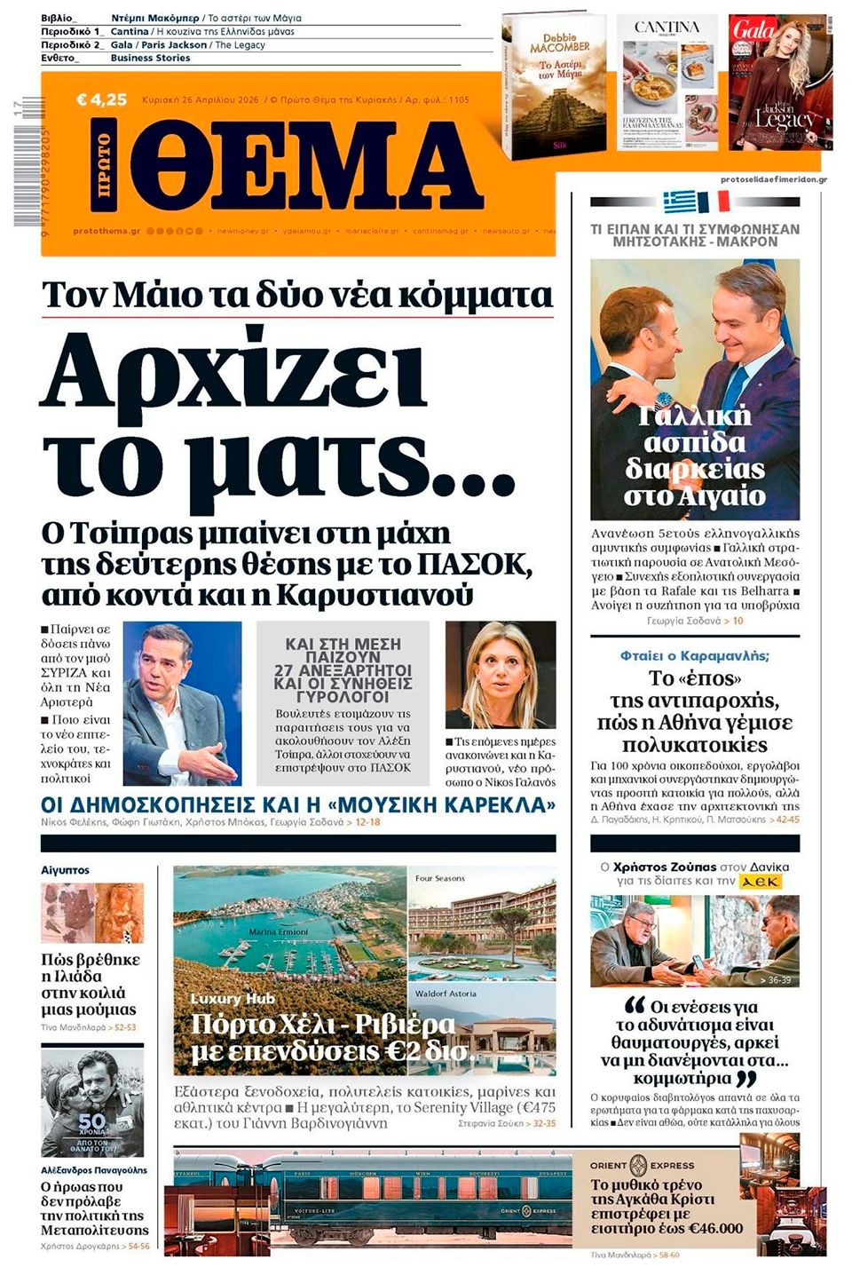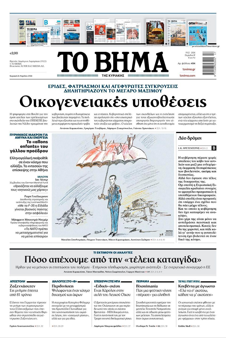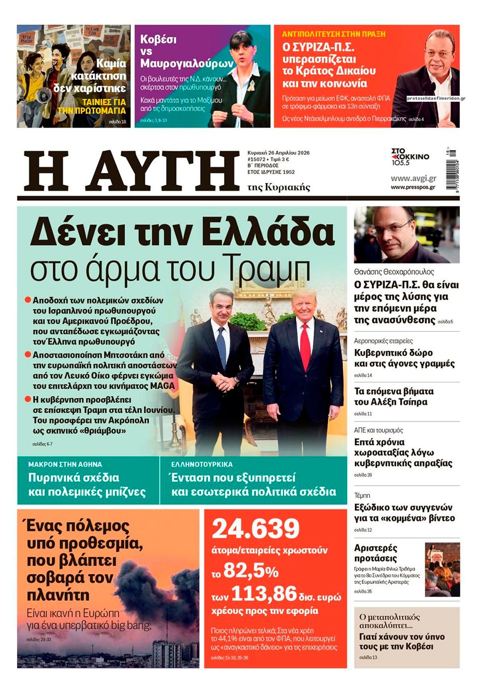 Mediatop2 Τα πρωτοσέλιδα των εφημερίδων της Κυριακής 26 Aπριλίου 2026 25/04/2026 17:24 FacebookXPinterestWhatsApp Διαβάστε τα πρωτοσέλιδα των εφημερίδων της Κυριακής 26 Aπριλίου 2026