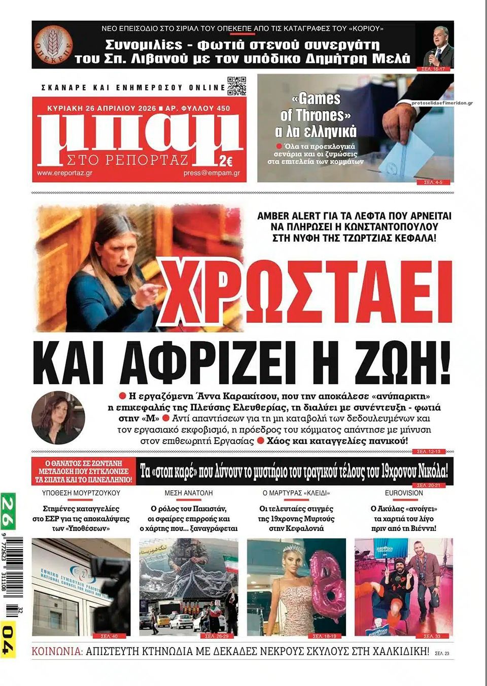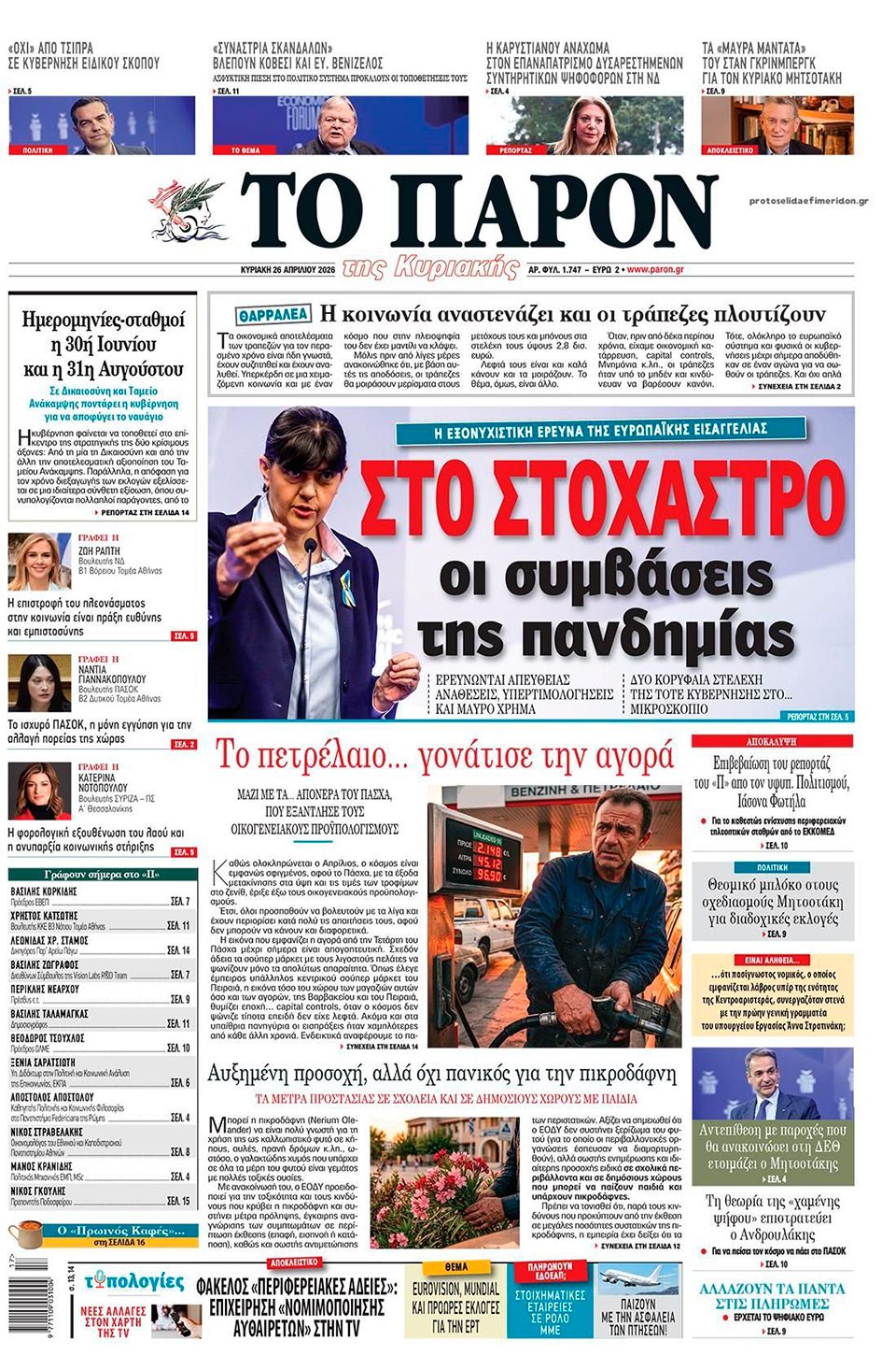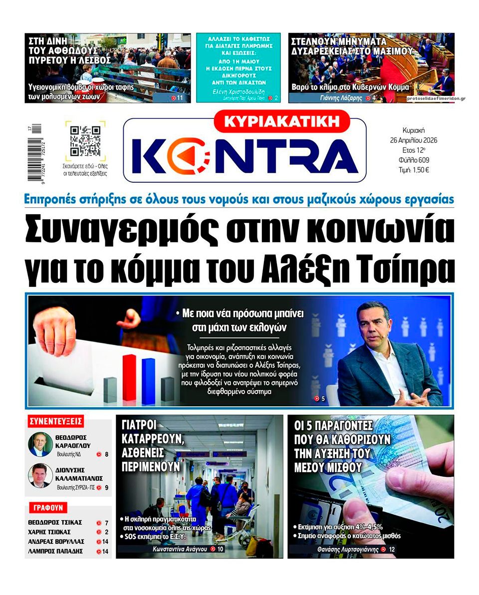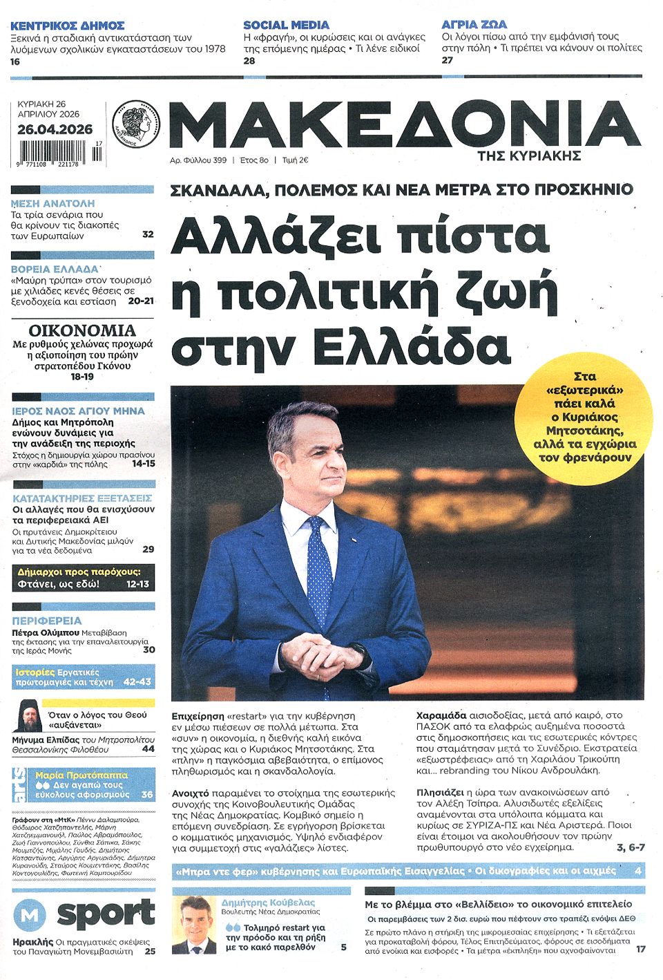 Mediatop2 Τα πρωτοσέλιδα των εφημερίδων της Κυριακής 26 Aπριλίου 2026 25/04/2026 17:24 FacebookXPinterestWhatsApp Διαβάστε τα πρωτοσέλιδα των εφημερίδων της Κυριακής 26 Aπριλίου 2026