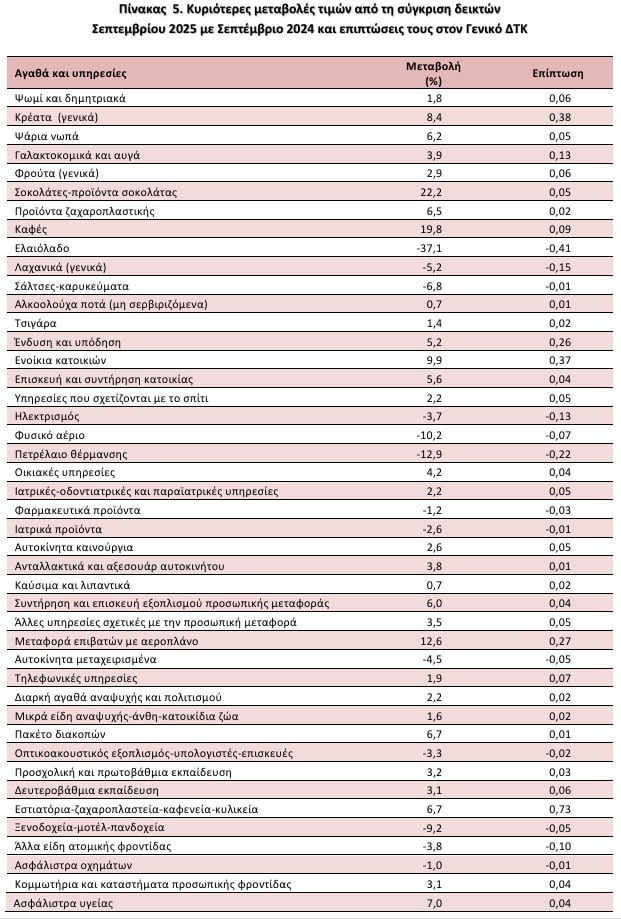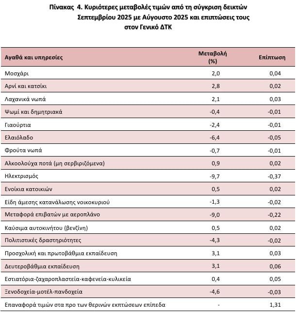 Η αύξηση του δείκτη τιμών καταναλωτή κατά 1,9% τον μήνα Σεπτέμβριο 2025, σε σύγκριση με τον αντίστοιχο Δείκτη του Σεπτεμβρίου 2024, προήλθε κυρίως από τις μεταβολές στις ακόλουθες ομάδες αγαθών και υπηρεσιών: