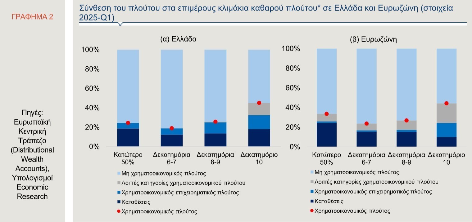 Μολονότι η αναλογία της αξίας του μη χρηματοοικονομικού πλούτου στην αξία του συνολικού ακαθάριστου πλούτου είναι σταθερά υψηλή στην Ελλάδα είναι χρήσιμο να διερευνηθεί κατά πόσο έχει μεταβληθεί τα τελευταία έτη η σύνθεση του συνολικού πλούτου ανά περιουσιακό στοιχείο. Επιπρόσθετα, χρησιμοποιώντας την ταξινόμηση των νοικοκυριών σε δεκατημόρια (deciles), όπως την παρουσιάζει η ΕΚΤ με κριτήριο τον καθαρό πλούτο που κατέχουν (δηλαδή η διαφορά του ακαθάριστου πλούτου μείον το χρέος των νοικοκυριών), αναλύεται η σύνθεσή του ανά κλιμάκιο πλούτου και συγκρίνεται με την αντίστοιχη στην Ευρωζώνη. Τα αποτελέσματα καταδεικνύουν σημαντικές ομοιότητες αλλά και διαφορές στην κατανομή της ιδιοκτησίας των περιουσιακών στοιχείων τόσο μεταξύ των νοικοκυριών στην Ελλάδα, όσο και σε σύγκριση με την Ευρωζώνη.