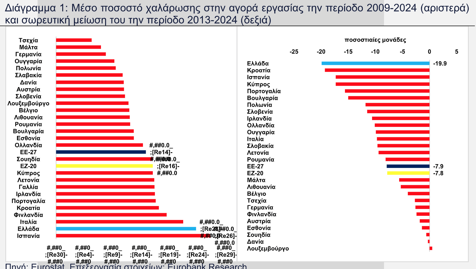 Ξεκινώντας την ανάλυση, προκύπτει ότι την περίοδο 2009-2024 η χαλαρότητα στην ελληνική αγορά εργασίας, ως ποσοστό του «εκτεταμένου» εργατικού δυναμικού, διαμορφώθηκε σε 24,7% και ήταν η δεύτερη υψηλότερη μετά την Ισπανία (27,2%) ενώ τα αντίστοιχα ποσοστά σε ΕΕ-27 και ΕΖ-20 διαμορφώθηκαν σε χαμηλότερα επίπεδα (15,9% και 17,1% αντίστοιχα). Η εικόνα αυτή αιτιολογείται από το πολύ υψηλό ποσοστό ανεργίας που παρουσίασε η Ελλάδα την περίοδο της εγχώριας οικονομικής κρίσης καθώς αυτό διαμορφώνει το 71% περίπου του ποσοστού χαλάρωσης στην αγορά εργασίας. Ωστόσο, συγκρίνοντας το ποσοστό της Ελλάδας μεταξύ 2013 που παρουσίασε την υψηλότερη τιμή του (34,3%) και 2024 (14,4%), προκύπτει ότι μειώθηκε κατά 19,9 π.μ. που αποτελεί την ισχυρότερη μείωση μεταξύ των χωρών της ΕΕ-27.